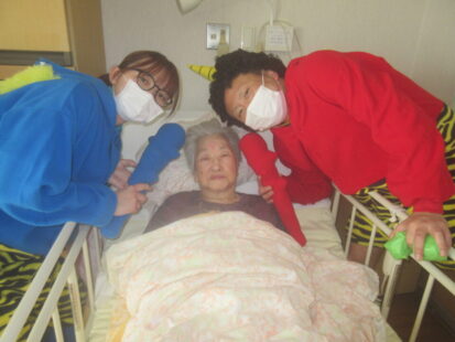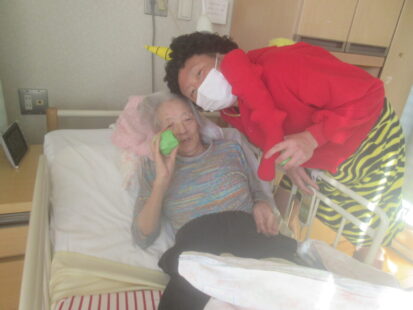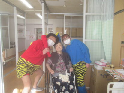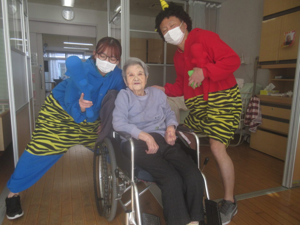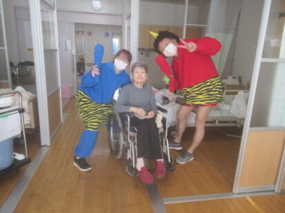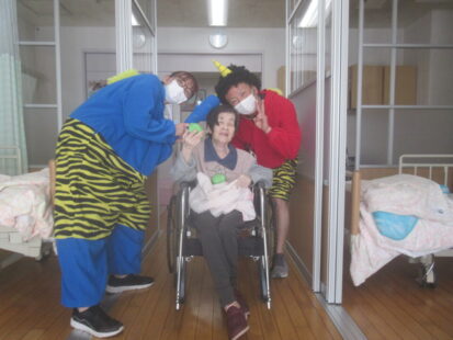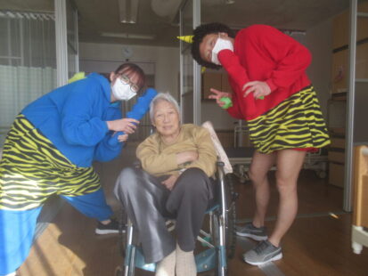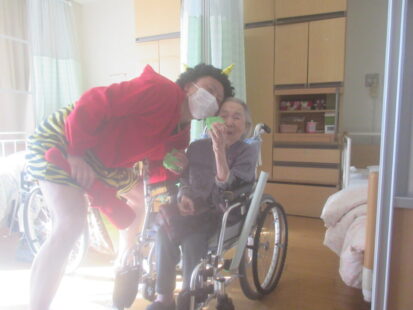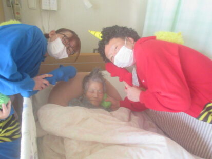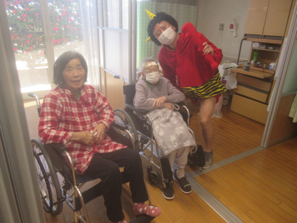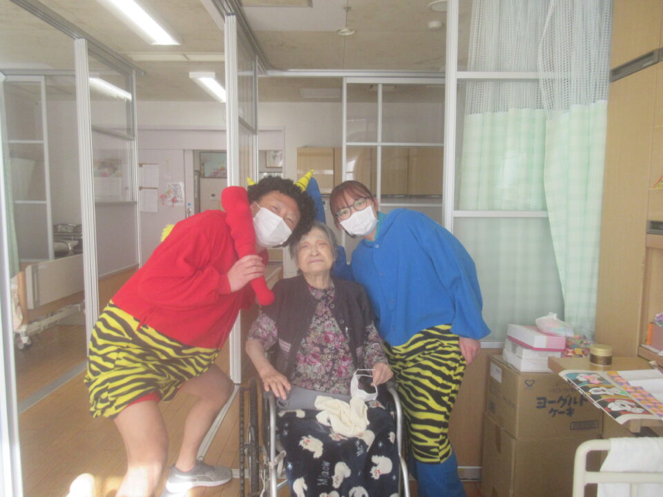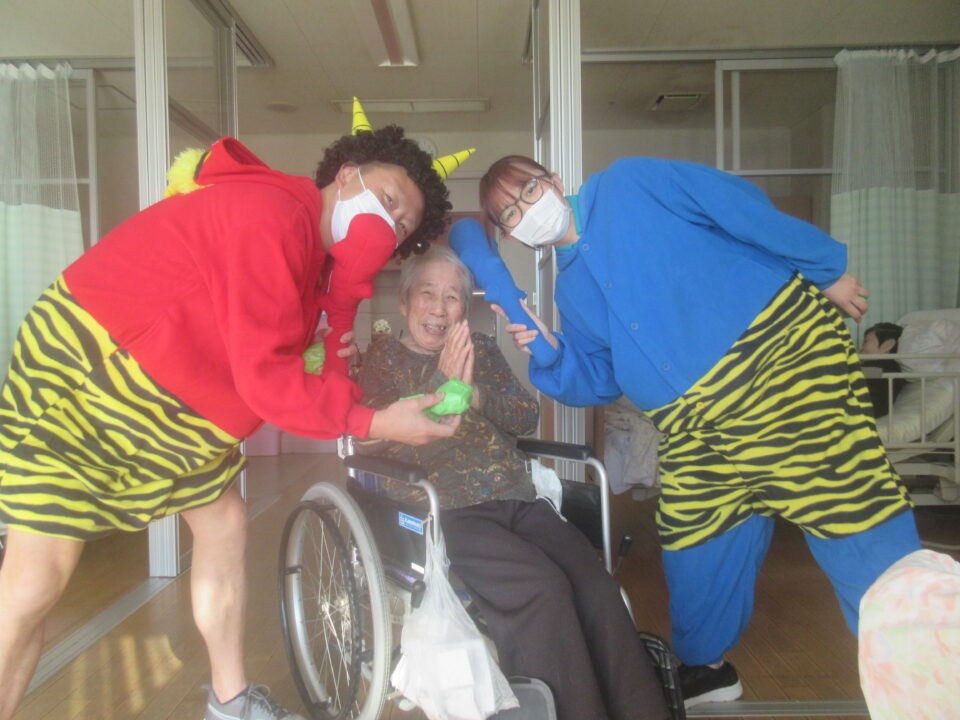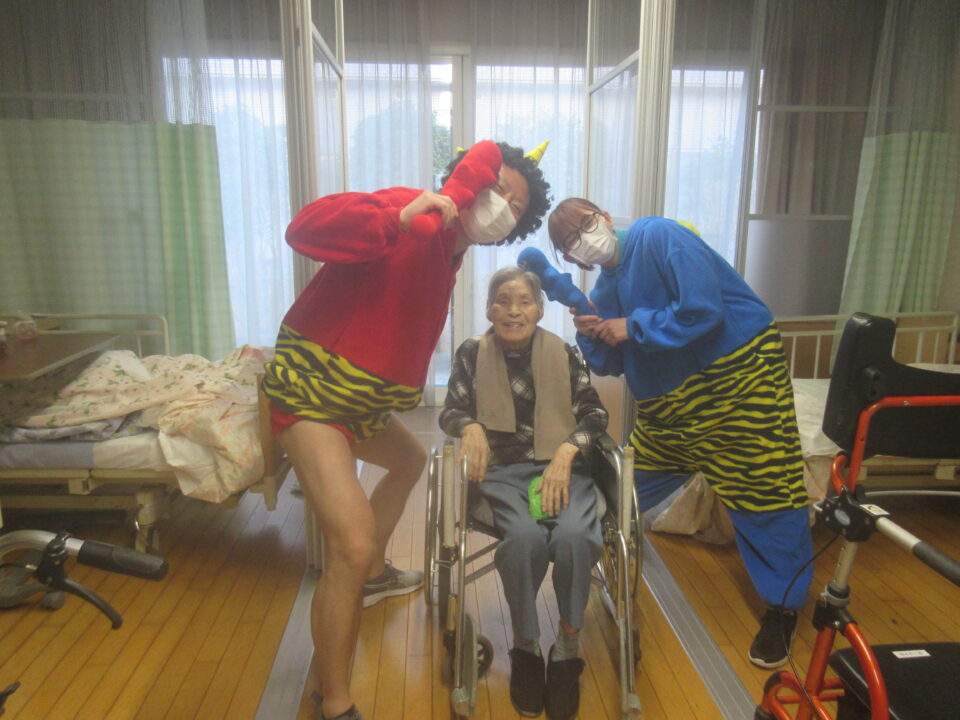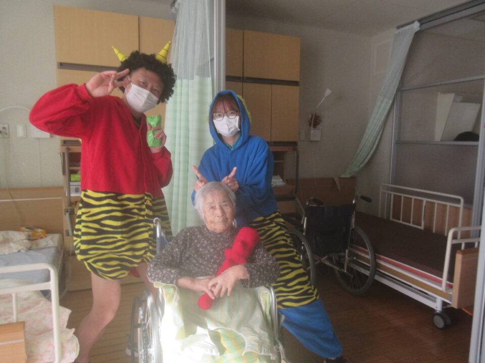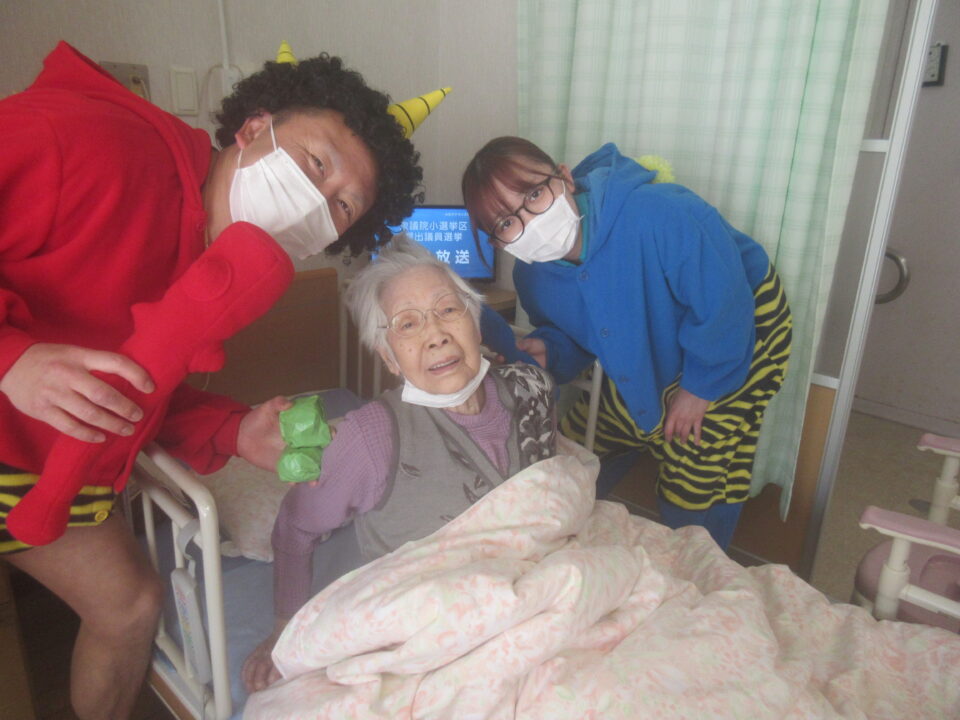 お手製の玉で豆まき!お部屋1つ1つにお伺いしました。