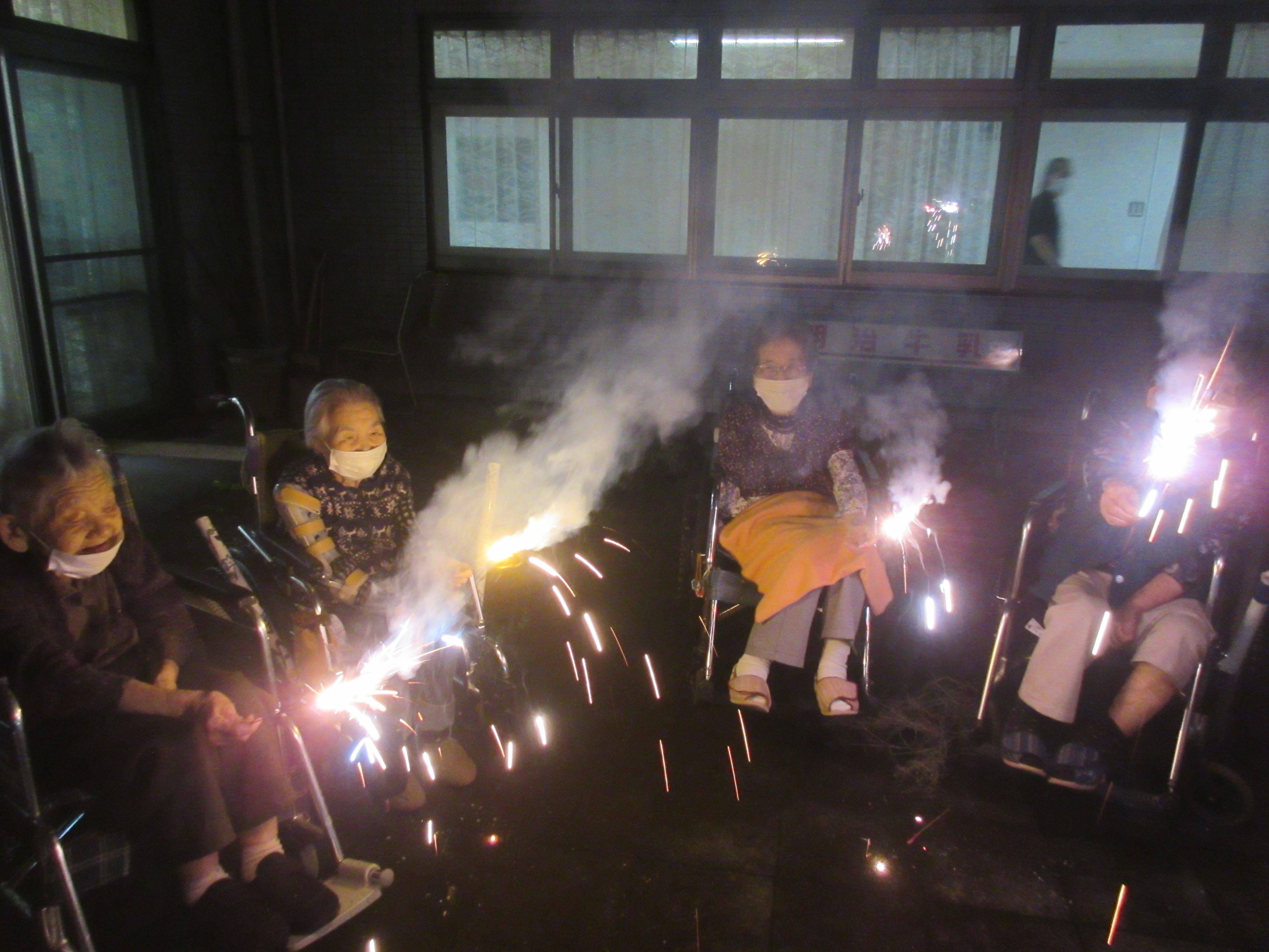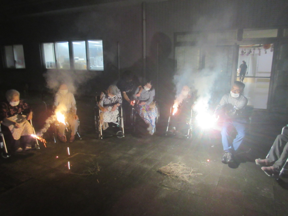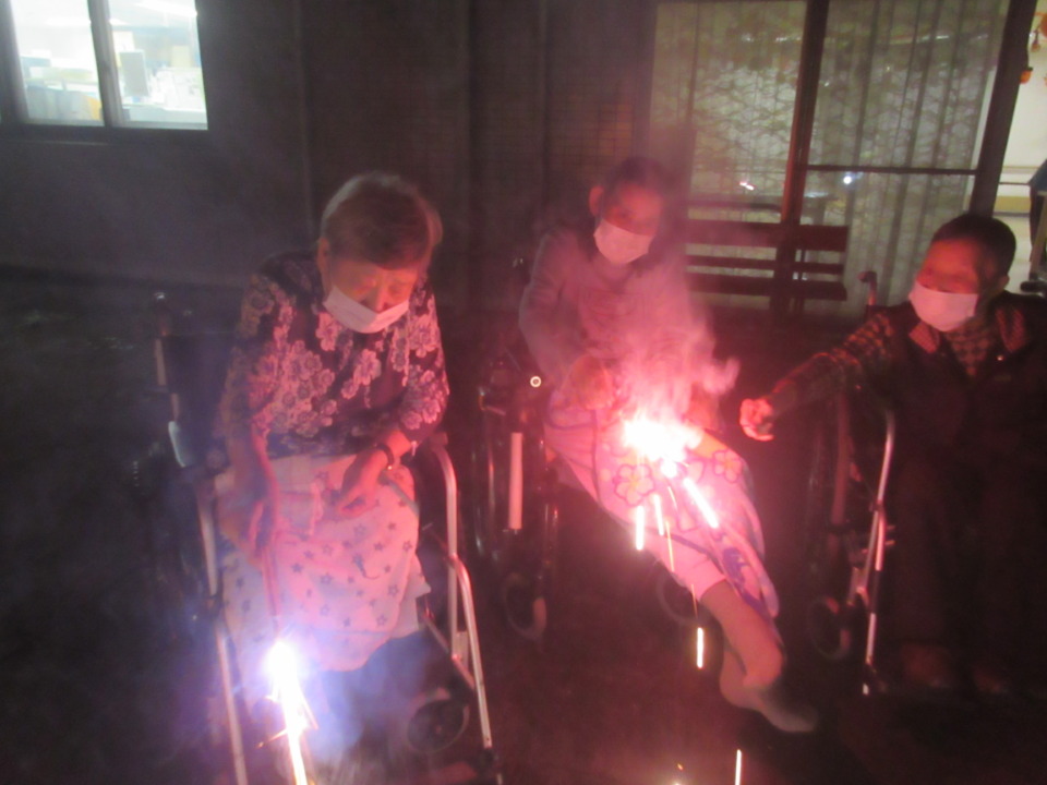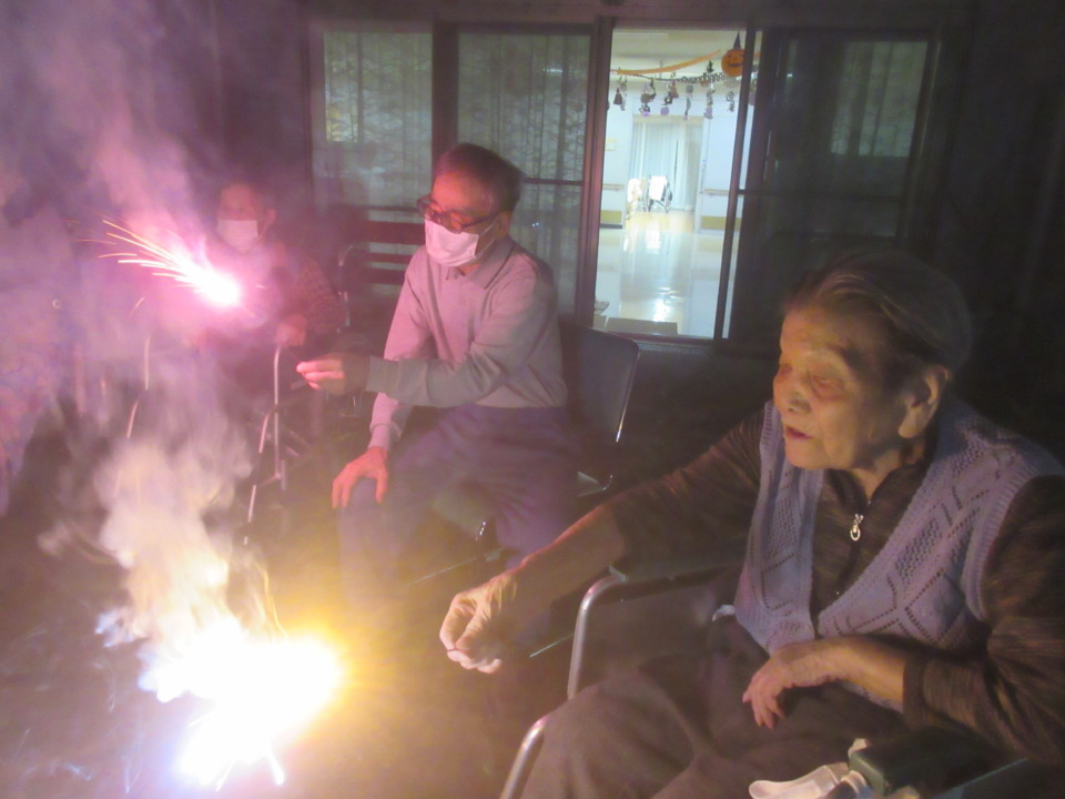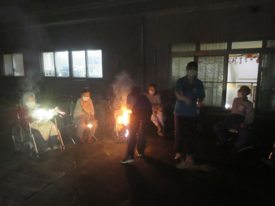 > 中庭で花火やりました!